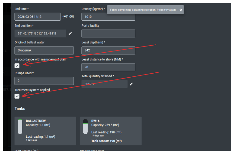 Ballast operation completion fails when attempting marked as treatment in accordance with BWMP: