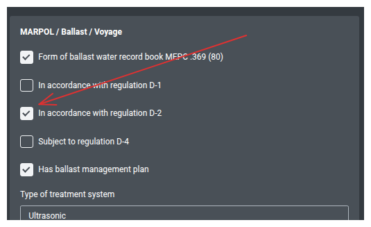 Some vessels experience error messages when attempting to completing ballast operations in TelScope. The reason is usually an inconsistency between the ship settings and the ballast operation: The ship is registered with D1 compliance in ship settings and the user attempts to completes a ballast water operation with "treatment enabled" and "in accordance with BWMP" checked. This solution is to enable "D2 compliance" in ship settings, assuming that the vessel is indeed D2 compliant.